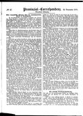 22. November , Seite 1"...No. 47. Provinzial-Correspondenz. Vierzehnter Jahrgang. 22. November 1876. Eine französische Stimme über die wirthschaftliche Krisis in Deutschland. In der bedeutendsten französischen Zeitschrift, der » Revue des deux Mondes «, befindet sich ein Aufsatz des bekannten volkswirthschaftlichen Schriftstellers Lavisse über »die wirthschaftliche Krisis in Deutschland«, in welchem neben einzelnen Aeußerungen nationalen Uebelwollens, wie sie in der französischen Presse gegenwärtig hergebracht sind, in mancher Beziehung ein so unbefangenes und klares Gesammturtheil über unsere augenblicklichen wirthschaftlichen Verhältnisse zu erkennen ist, wie es selbst in einheimischen Darstellungen zur Zeit nicht häufig hervortritt. Namentlich die Schlußandeutungen des Verfassers über die Aussichten auf ein unfehlbares Wiederaufblühen der deutschen Industrie erscheinen gegenüber dem Kleinmuth und der Schwarzmalerei, die in deutschen Schilderungen so vielfach hervortreten, im Munde eines französischen Beobachters von doppeltem Inter ..."Provinzial-Correspondenz